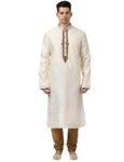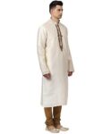 Perfectly cut, this fawn colored kurta set from the house of Raymond radiates oodles of style and class. The 100% polyester fabric makes this kurta set for men soft and super comfortable to wear. Pair up this kurta set brown colored juttis. Kurta with embroidery all over, band collar and full sleeves. Churidar with drawstring fastening.