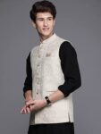 Love contrasts in ethnic outfits? Manyavar brings to you this colour shade jacket that perfectly compliments dark colored kurta set. Try this piece now.